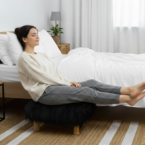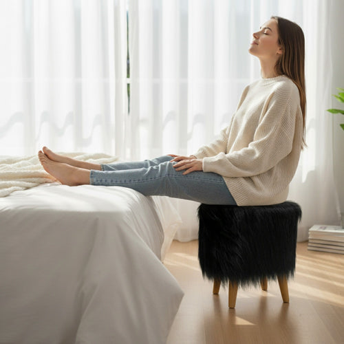 Bohemian Home Round Utility Padded Stool/ Ottoman Natural Finish - 4 Leg, Black Faux Fur
