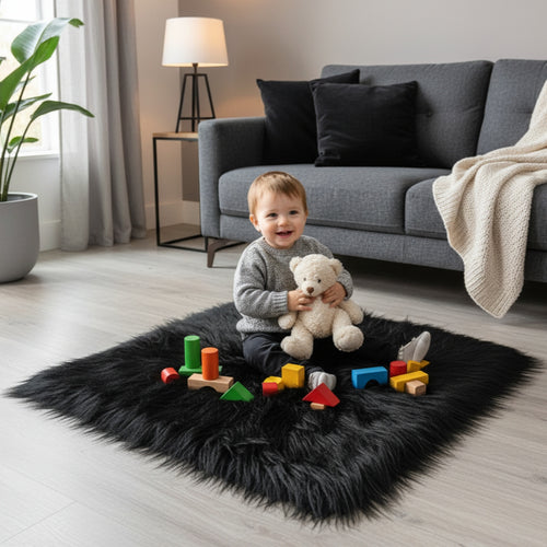 Black Faux Fur Mat, Luxury Fluffy Area Rug - 2x2 feet