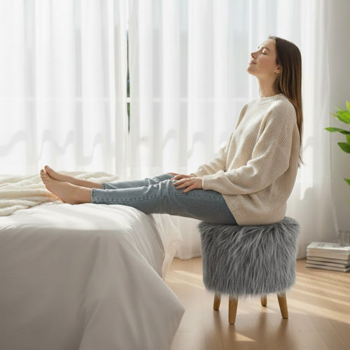 Bohemian Home Round Utility Padded Stool/ Ottoman Natural Finish - 4 Leg, Gray Faux Fur