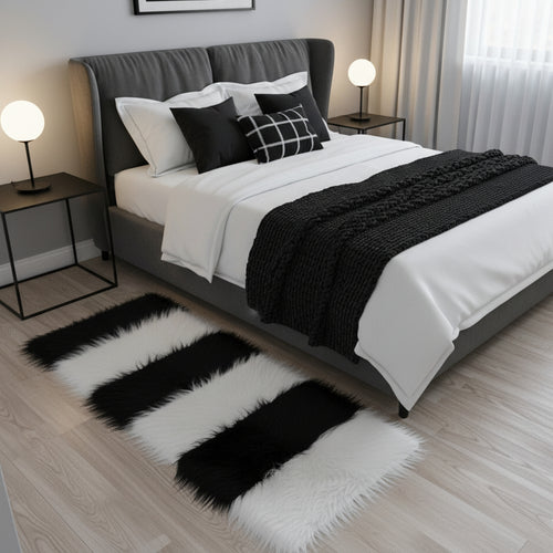 Black & White Bedside Faux Fur Runner, Luxury Fluffy Runner