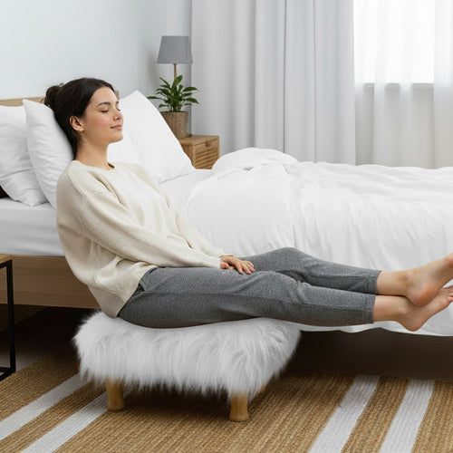 Bohemian Home Round Utility Padded Stool/ Ottoman Natural Finish - 4 Leg, White Faux Fur