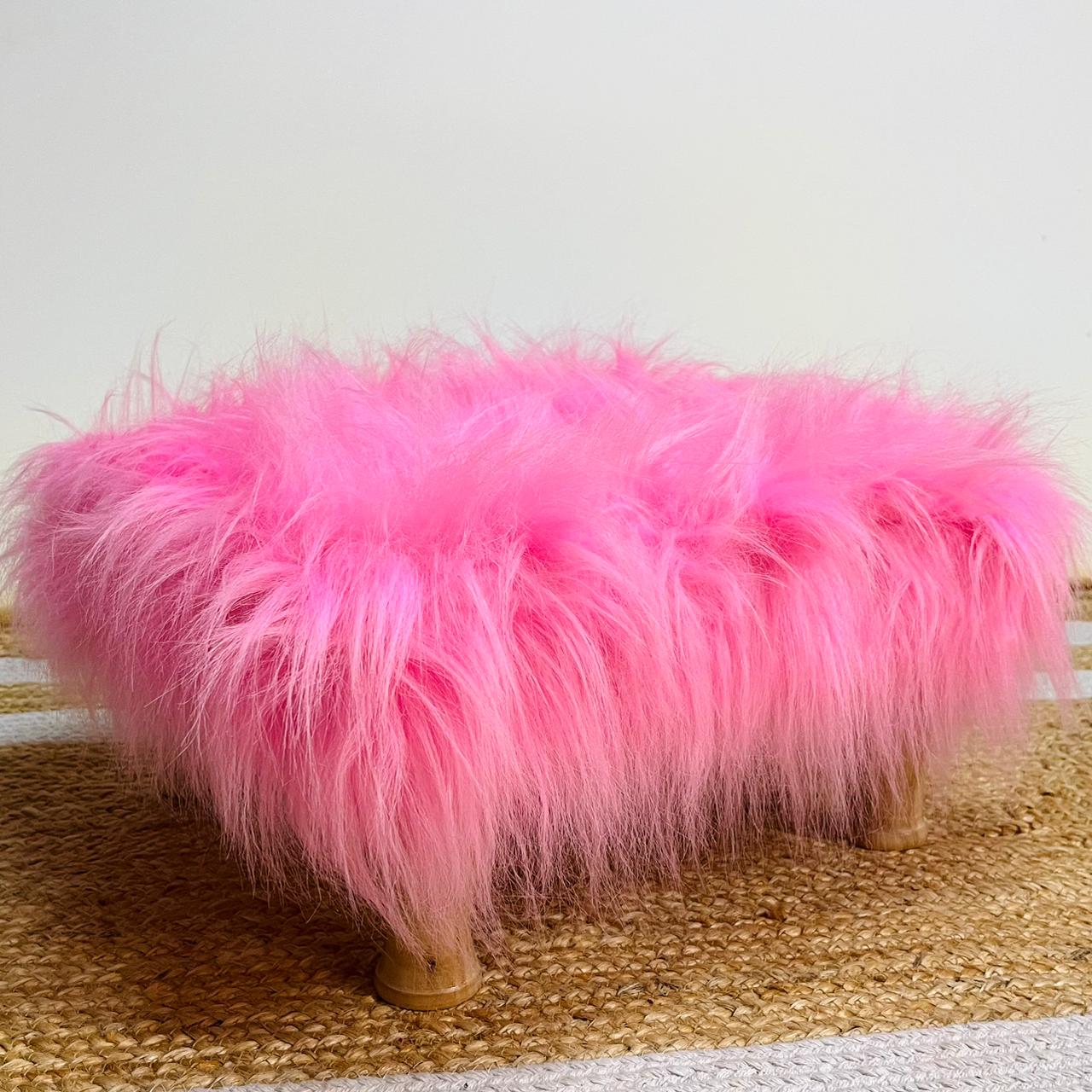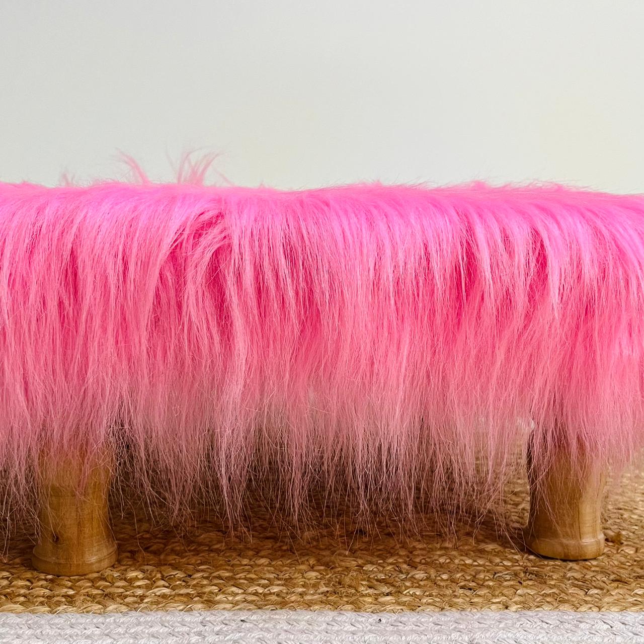 Small Chowki/Stool Square Utility Padded Natural Finish - Pink Faux Fur (4-Leg)