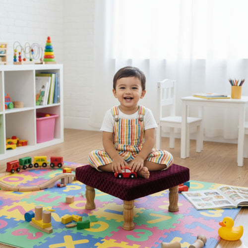 Small Chowki/Stool Square Utility Padded Natural Finish - Red_Multi (4-Leg)