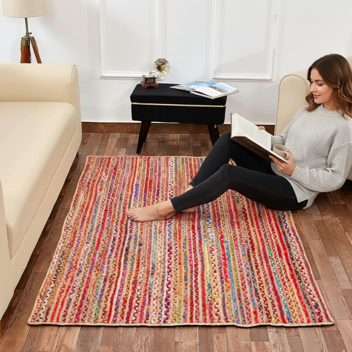 Braided Natural Jute & Multi Cotton Collection Classic Hand Woven Area Rug
