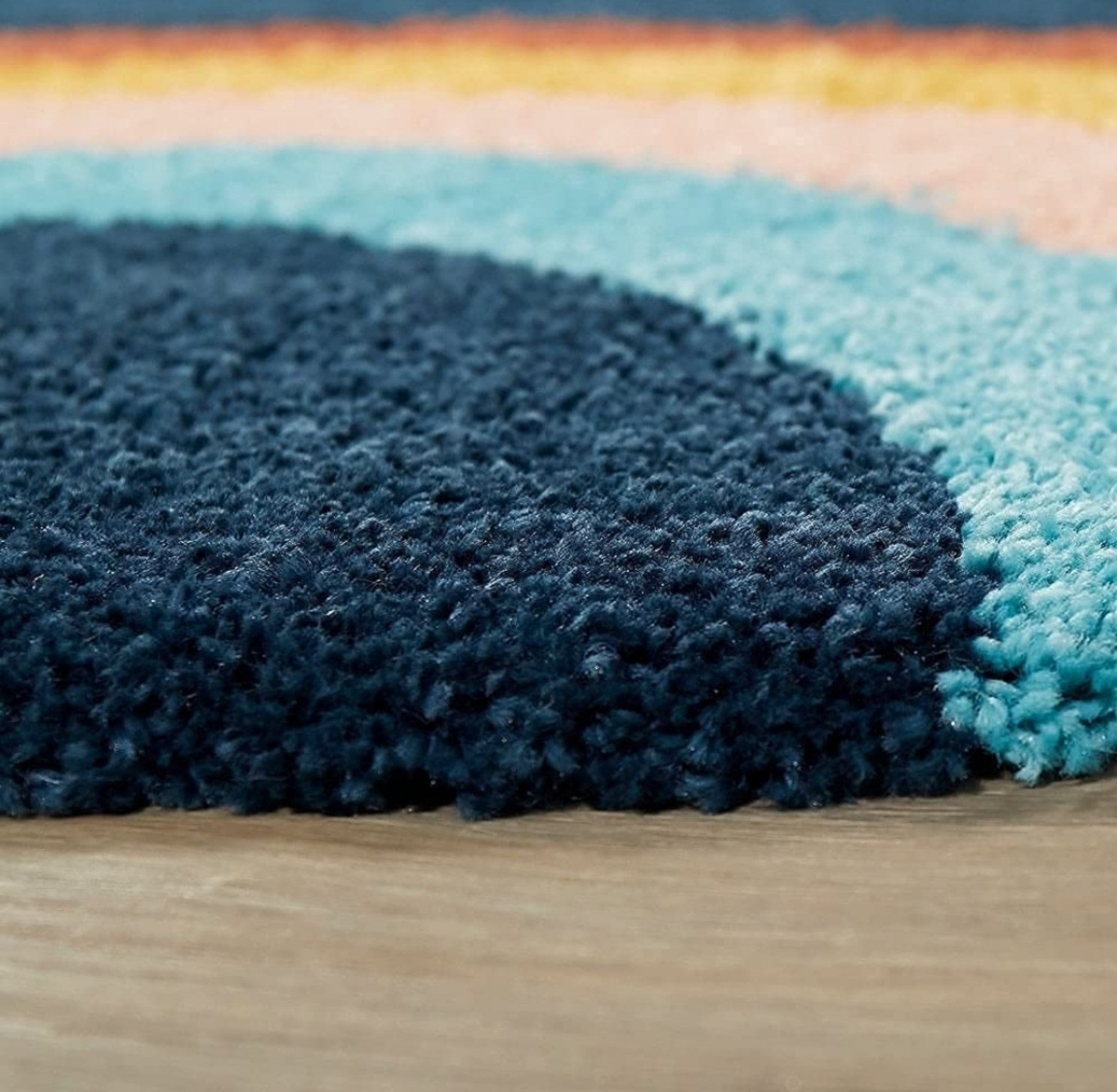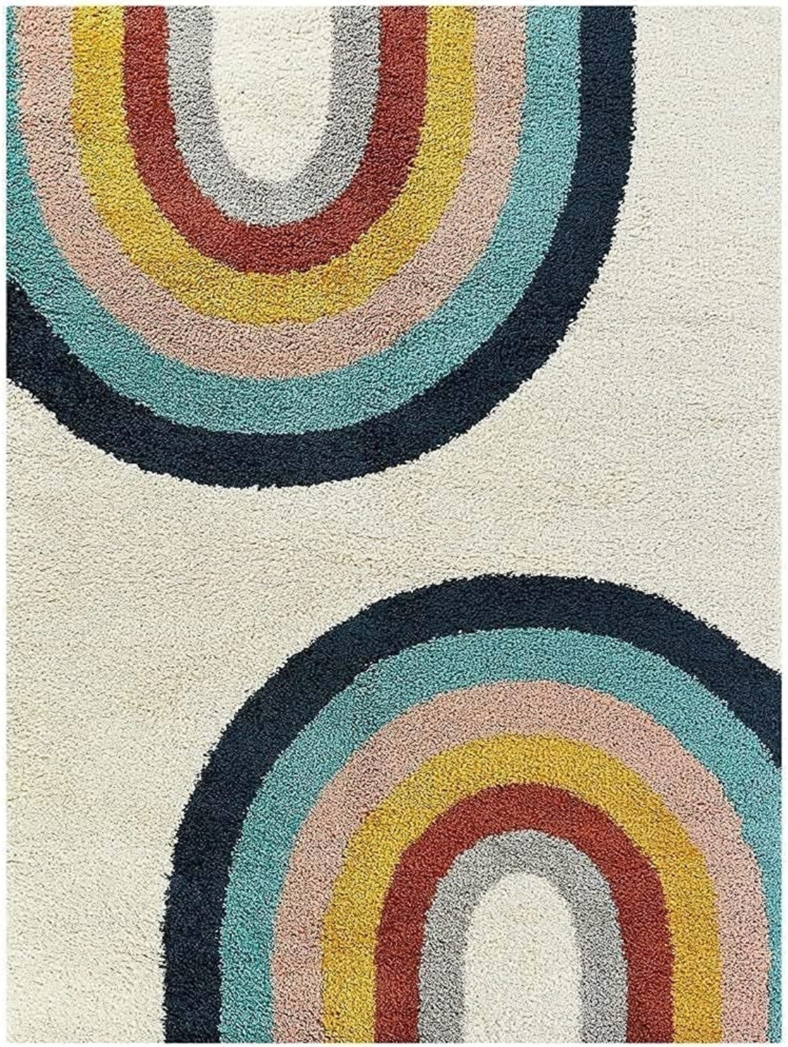 Multicolored rainbow-shaped rug on a wooden floor with a chair, ottoman, and plant in the background.
